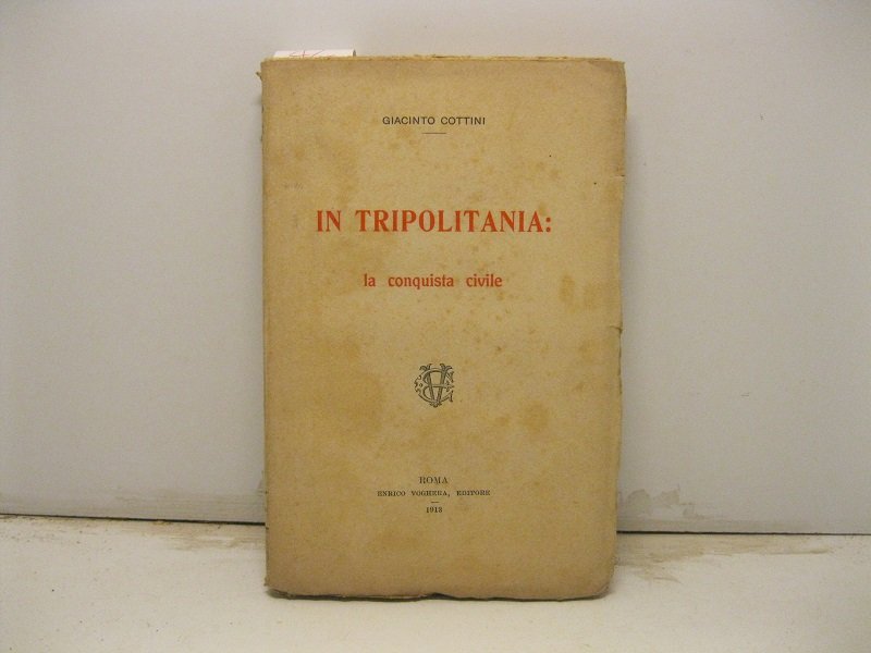 In 16, pp. 188 + (4). Leggere fioriture ai p. Br. ed. Argomenti: L'Africa settentrionale di fronte alla conquista; Gli stranieri e l'occupazione; Gli indigeni e noi; Gli intermezzi: fra i quattromila beduini accampati alle porte della citta'; Tripoli les bains; Chiese ed istituti cattolici; Una pagina confortante di statistica; il disagio economico; Il problema dell'insegnamento coloniale; La pace e' fatta: viva la pace!