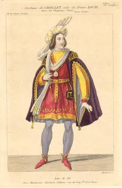 Incisione raffigurante il baritono e tenore Jean Baptiste Chollet nel costume di scena del Principe Louis nell'atto secondo e terzo de "Les Chaperons Blancs" di Daniel Auber. 1840 circa.