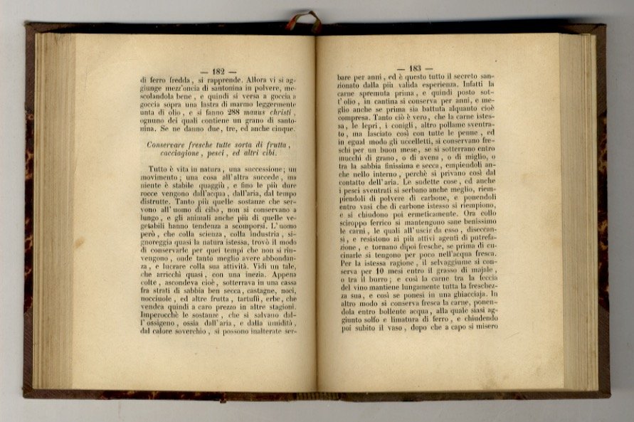 Roma, Tipografia Tiberina, 1856, in-16, legatura novecentesca in mezza tela con punte, pp. 382. Interessante manuale con nozioni varie su: arti, mestieri, metalli, vernici, ricette, formule, igiene domestica, farmaceutica, conservazione dei cibi preparazione e conservazione dei vini. Buon esemplare.