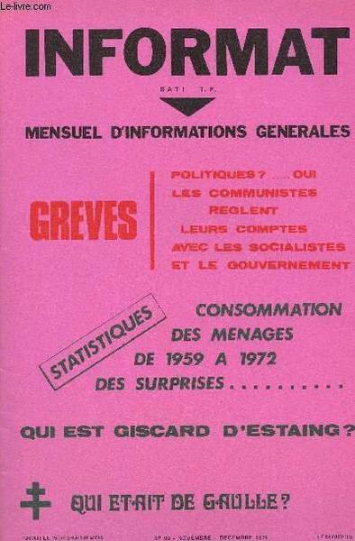 Informat Bati - T.P. n�92 - Mensuel d'informations g�n�rales - Gr�ves : politiques oui, les communistes r�glennt leurs comptes avec les socialistes et le gouvernement - Statistiques: consommation des m�nages de 1959 � 1972, des surprises.