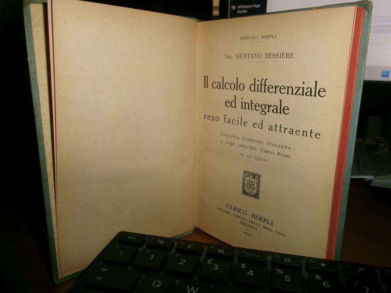 Ing. G. Bessière. IL CALCOLO DIFFERENZIALE ed INTEGRALE reso facile ed attraente. Seconda edizione italiana. Milano, Ulrico Hoepli, 1930. In-16°, cartonato edit. con tagli in rosso. xi, 259 pp. con 53 figure. Ben conservato con normali segni del tempo. Neg. scat. ultimi Hoepli