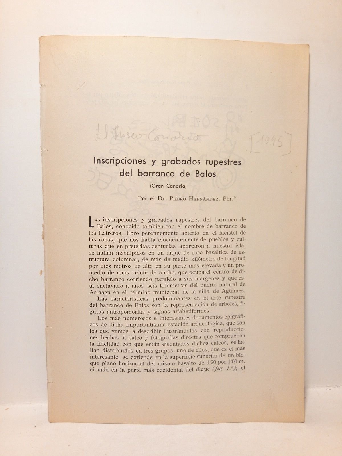 [Las Palmas de Gran Canaria]: El Museo Canario - CSIC, [1945].- 25 p.: Ilustraciones entre el texto; 4º (24 x 16,5 cm); Cubiertas provisionales.- Desglosado de la la Rev. El Museo Canario.* Por carecer de cubiertas, se le han puesto unas de papel para su mejor conservación. PALEONTOLOGÍA, PREHISTORIA Y PROTOHISTORIA