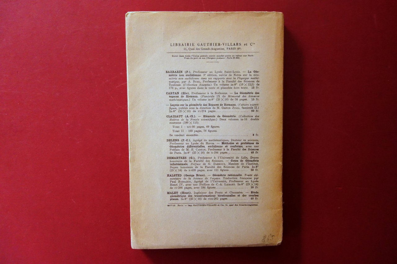 Gauthier-Villars et C., Editeurs, Paris, 1931; cm 25,5x16,5; pp. VI-292; brossura ed. Alla terza di copertina applicata etichetta di vecchia libreria rivenditrice. Edizione francese.