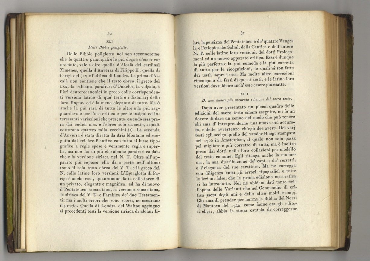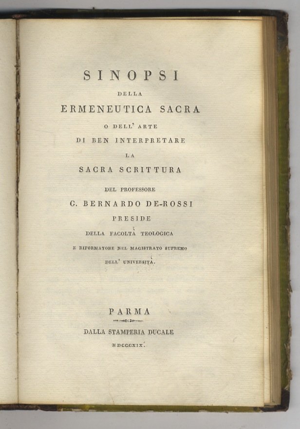 Introduzione alla Sacra Scrittura che comprende le prenozioni più importanti relative ai testi originali e alle loro versioni del professore G. Bernardo De-Rossi preside della facoltà teologica. [Legato con:]. DE ROSSI Giovanni Bernardo. Sinopsi dell'ermeneutica sacra o dell'arte di ben interpretare la sacra scrittura del professore G. Bernardo de Rossi preside della facolta teologica e riformatore nel magistrato supremo dell'università.