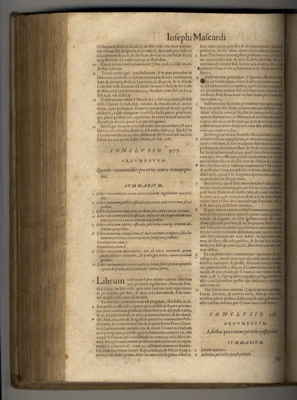 Iosephi Mascardi iurisconsulti Sarzanensis protonotarii apostolici [.] Conclusiones probationum omnium [.] quibus canonicae civiles, feudales criminales, caeteraeque materiae continentur [.] Volumen primum [- volumen tertium].