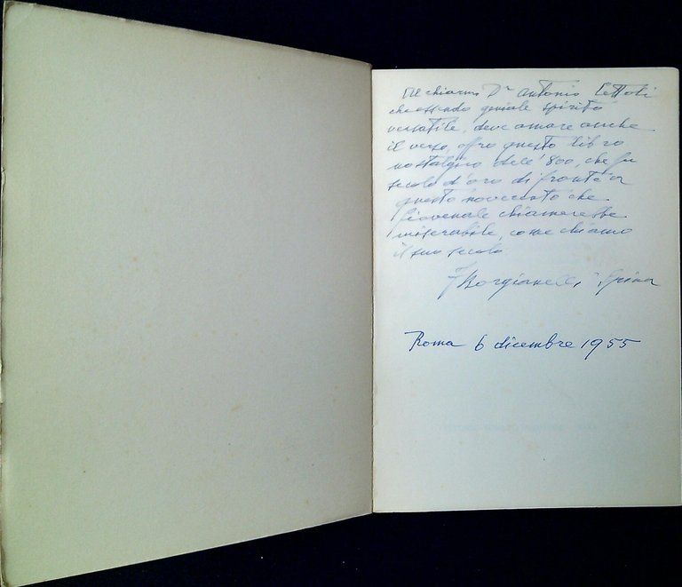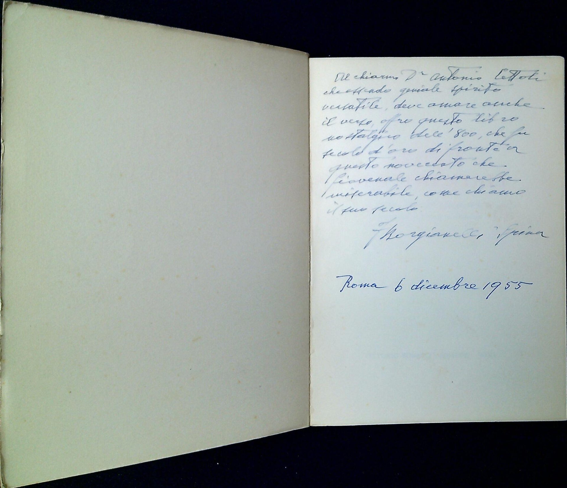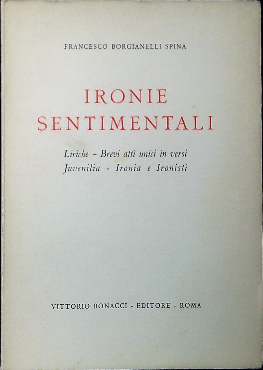 Borgianelli Spina, Francesco Ironie sentimentali : liriche, brevi atti unici (Juvenilia, Ironia e ironisti). Roma, V. Bonacci 1950, 190 p. ; 20 cm Lunga dedica autografa dell'autore alla prima bianca (68402)