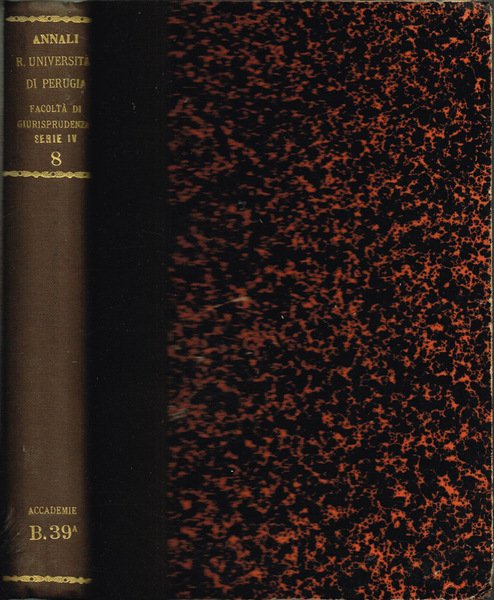Volume XXXIII della collana Istituto Giuridico dell'Università di Perugia - Annali della Facoltà di Giurisprudenza, Vol. III della Serie IV. Volume degli anni '20 del '900 in stato discreto, rilegato con coperta, non coeva, in mezzatela con angoli, piatti marmorizzati, sul dorso fregi e caratteri dorati in bassorilievo, bordo leggermente consumato, ammaccature, lievi macchie, tracce di fioritura sparsa, tagli leggermente ambrati, quello di testa di colore bordeaux, pagine in buono stato, qualcuna e margini poco ambrati, alcune pagine con becca. Il rilegatore ha mantenuto all'interno del volume il piatto anteriore originale del I.o fascicolo, in cartoncino, con catalogazione bibliotecaria manoscritta e fregio. Presenta talloncino in carta con catalogazione bibliotecaria su risguardia, timbro ex biblioteca su frontespizio e sul margine di piede di qualche pagina. Lingue: Italiano, Latino. Numero Pagine 699