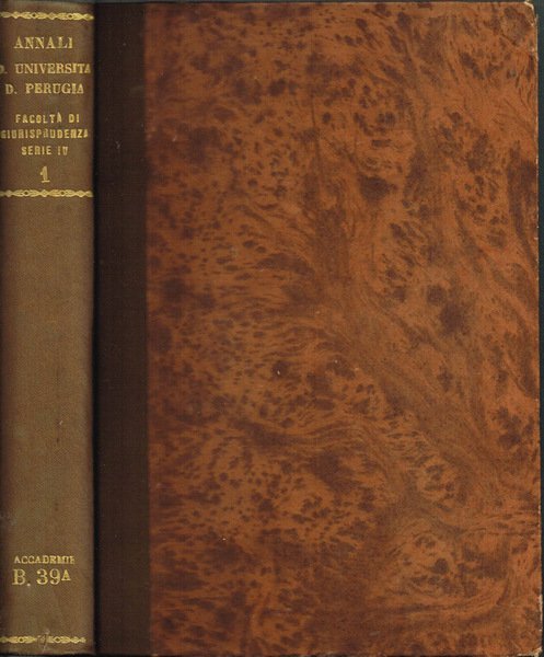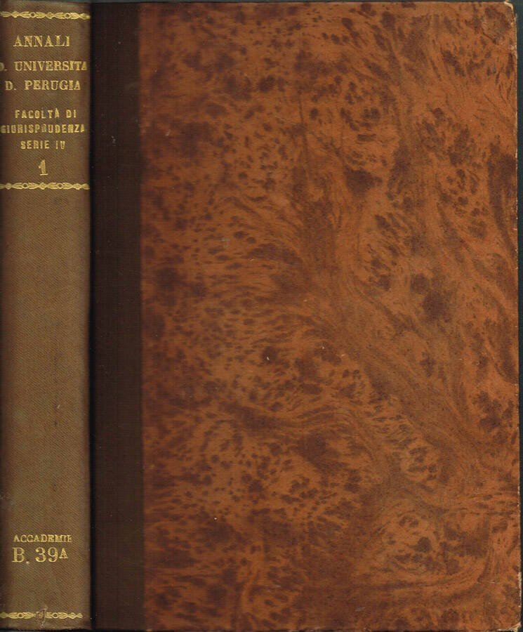 Volume XXXI della collana Istituto Giuridico della Università di Perugia - Annali della Facoltà di Giurisprudenza, Vol. I della Serie IV. Volume intonso della seconda decade del '900 in stato discreto, rilegato con coperta, non coeva, in mezzatela con angoli, piatti marmorizzati, sul dorso fregi e caratteri dorati in bassorilievo, bordo un po' consumato, qualche segno di sfregamento, tracce di fioritura sparsa, tagli leggermente ambrati, quello di testa brunito, pagine in buono stato, risguardie poco brunite. Il rilegatore ha mantenuto all'interno del volume i piatti originali del I.o fascicolo, in cartoncino, quello anteriore con catalogazione bibliotecaria manoscritta e fregio, quello inferiore con mancanza. Presenta timbro ex biblioteca su frontespizio e su excipit. Lingue: Italiano, Latino, Francese. Numero Pagine 559