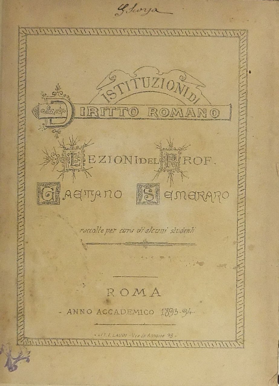 Istituzioni di diritto romano. Lezioni raccolte per cura di alcuni studenti. Anno accademico 1893-94 | Libri antichi e moderni | Semeraro Gaetano (1848-1923)