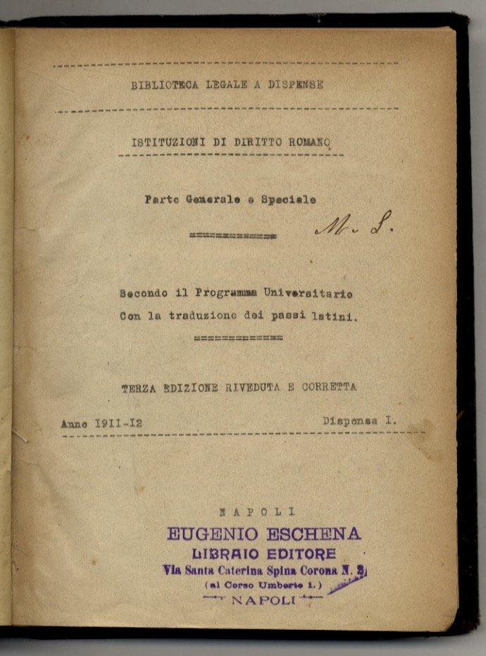 ISTITUZIONI di diritto romano. Parte Generale e Speciale. Secondo il Programma Universitario. Con la traduzione dei passi latini. Terza edizione riveduta e corretta. Anno 1911-12. Dispensa I.