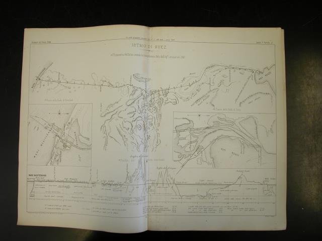 ISTMO DI SUEZ. Planimetria dell'Istmo secondo la triangolazione fatta dall'Ing. Larousse nel 1862. Due tavole tecniche di G.Levi in litografia Pozzo, tratte da "Giornale del Genio Civile", Parte non ufficiale, Serie C, Tavole n°15-16. | Libri antichi e moderni |