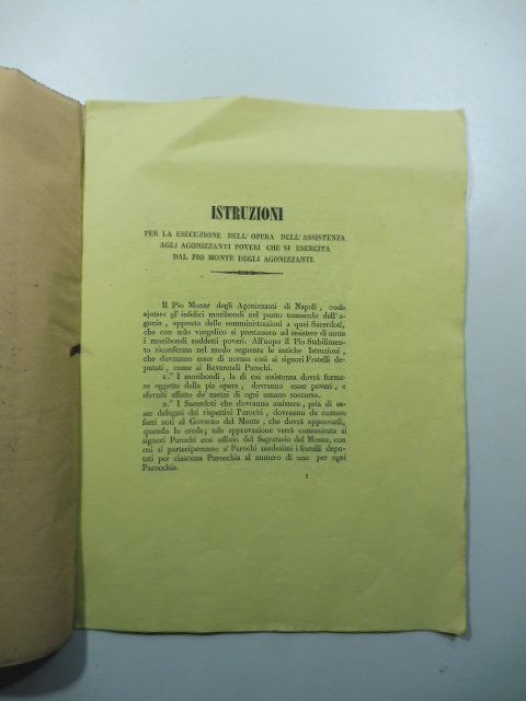 In 4 (cm 21 x 29), pp. 7 + (1b). Esemplare stampata su carta gialla. Brossura muta coeva. Pubblicazione priva di dati editoriali, ma ascrivibile al 1840 circa, con le istruzioni per i parroci, impartite dal Pio Monte degli Agonizzanti di Napoli, che intendessero prestare assistenza ai moribondi poveri. L'ultimo foglio comprende una sorta di modulo da compilarsi a cura del sacerdote in cui questi doveva certificare il nome di chi aveva assistito, il domicilio, il numero dei giorni impiegati, ecc.