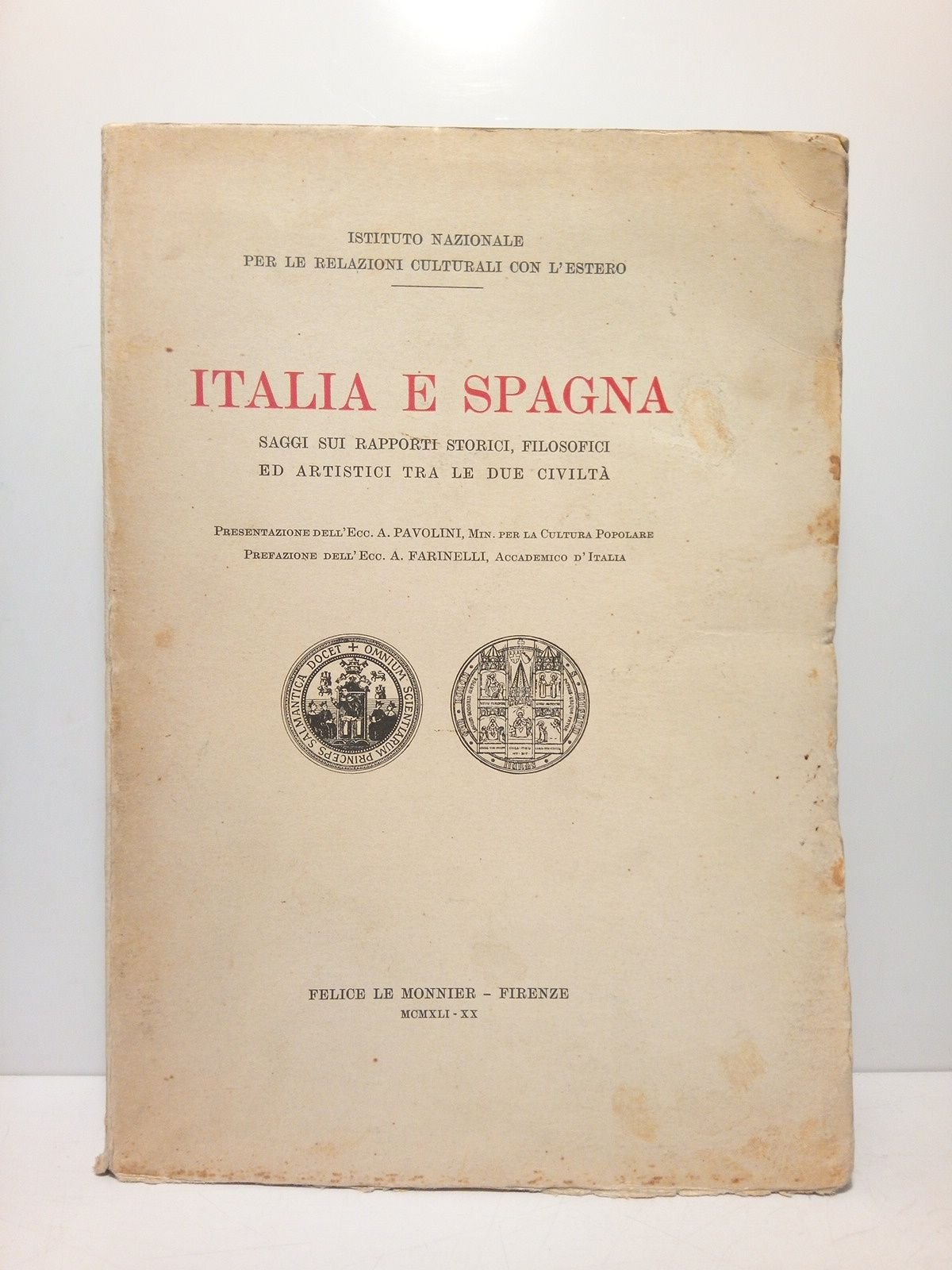 Italia e Spagna: Saggi sui raporti storici, filosofici ed artistici tra le due civilità / Presentazione dell'Ecc. A. Pavolini. Ministro per la Cultura Popolare; prefazione dell'Ecc. A. Farinelli. SAGGI DI: Lucio Ambruzzi; A. A. Bernardy; Giovanni Maria Bertini; Vitorio Bertoldi; Giulio Bertoni; Carlo Boselli; Anna Maria Brizio; Armando Carlini; Alberto Consoglio; Arturo Farinelli; Camillo Guerrieri Crocetti; Fausto Nicolini; Giovanni Papini; Amos Parducci; Romolo Quazza; Bernardo Sanvisenti; M. Federico Sciacca; Giovanni Soranzo; Luigi Sorrento; Francesco A. Ugolini; Adolfo Venturi
