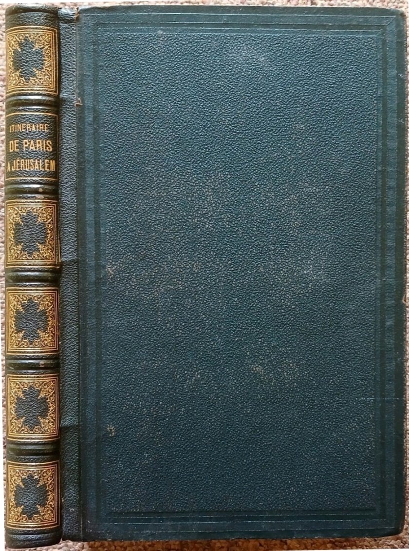 No added marks or inscriptions. No creasing to covers or to spine. Clean very tight pages with some foxing and with very slightly rubbed, debossed unmarked boards, very clear gilt embossing and lettering to bright seven-ridged spine, all page edges bright gilt, a little bumping/rubbing to edges and corners and damp mark to lower spine corner/some pages and also to upper edge of pages towards end of book. 348pp. The author set out in 1806 to travel from Paris to Jerusalem. This is an account of his travels and adventures. All text in French.