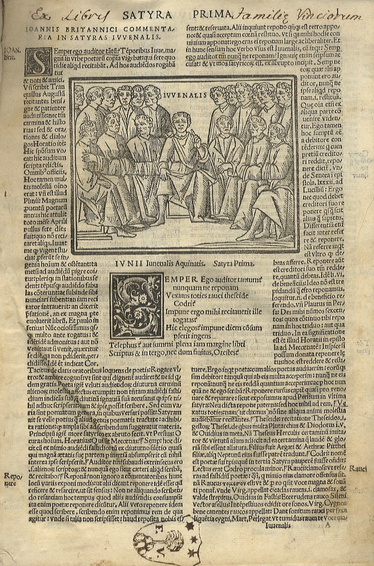 Iu. Iuvenalis Aquinatis Satyrographi Opus. Interprete Ioanne Britannico viro eruditissimo. Una cum Iodoci Badii Ascensii familiaribus explanationibus. Cum figuris apte appositis. Index praeterea omnium rerum in margine existentium secundum ordinem alphabeticum: ut facilius quaecumque volueris invenire possis.