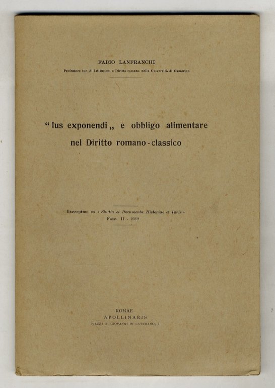 Ius exponendi e obbligo alimentare nel diritto romano-classico. | Libri antichi e moderni | Lanfranchi Fabio.