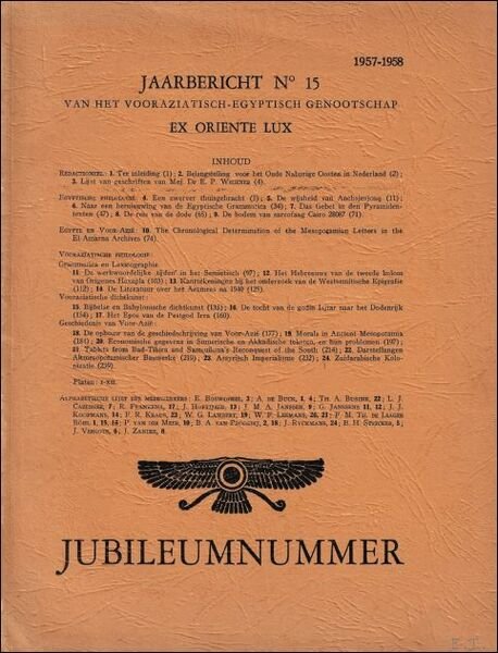 Originele uitgeversomslag, 20x26,5cm, 248pp + 12 buitentekstplaten z/w. Ex Oriente Lux, Journal of the ancient near eastern society/ Annuaire de la societe orientale, n? 15 1957 - 1958. Jubileumnummer. Onderverdeeld in Egyptische Philologie, Egypte en Voor-Azie, Vooraziatische Philologie, Grammatica en Lexicographie, Vooraziatische dichtkunst, geschiedenis van Voor-Azie.