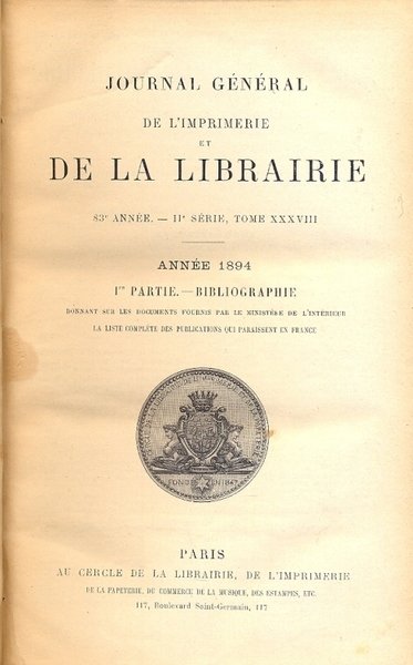 6 voll., in 8°, m. pelle. Ogni annata è composta da tre volumi : - 1894 - 1° vol. - Prima parte: Bibliografie pp. 1183. 2° e 3° vol. - Terza parte: Feuilleton, pp. 2584. 1895 - 1° vol. - Prima parte: Bibliografie pp. 2306. 2° e 3° vol. - Terza parte : Feuilleton, pp. 3520. Lettere e fregi ai d. in o. Nervetti. Piatti marmorizzati. I primi volumi di entrambe le annate presentano una rilegatura delle pp. discontinua. Collazionati.