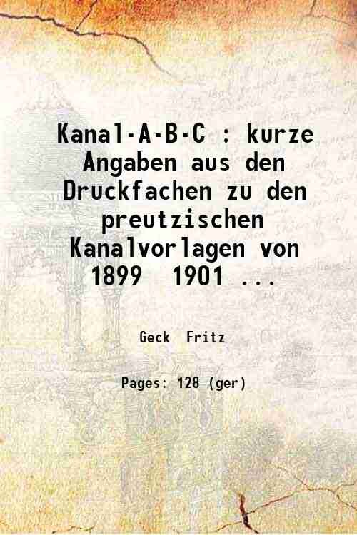 Kanal-A-B-C : kurze Angaben aus den Druckfachen zu den preutzischen Kanalvorlagen von 1899 1901 und 1904 aus der Reichsstatistik und sonstigen amtlichen wie anderen Druckschriften / von Fritz Geck. 1904