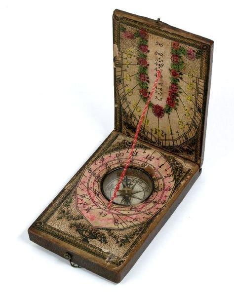 Holz beklebt mit kolorierten Kupferstichen. Diptychon, auf der Oberseite Polhöhentabelle von europäischen Städten, im Boden eingelassene Kompassbüchse mit gebläuter Stahlnadel. Der Deckel mit den Polhöhentabellen bis zur Unkenntlichkeit berieben, sonst tadellos mit intaktem Polfaden und Metallscharnier. - Vgl. Syndram, Wissenschaftliche Instrumente und Sonnenuhren, Kataloge der Kunstgewerbesammlung Stiftung Huelsmann Bd. 1, Nr. 41.