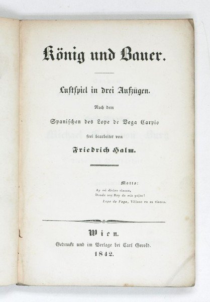 König und Bauer. Lustspiel in drei Aufzügen. Nach dem Spanischen des Lope de Vega Carpio frei bearbeitet. | Libri antichi e moderni | Halm, Friedrich [D. I. Eligius Freiherr V. Münch-Bellinghausen].