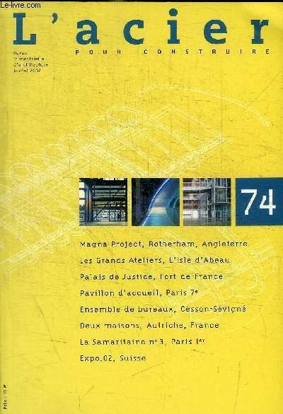 L ACIER - POUR CONSTRUIRE - REVUE TRIMESTRIELLE D ARCHITECTURE - N° 74 - JUILLET 2002 - MAGNA PROJECT ANGLETERRE / LES GRANDS ATELIERS, LISLE D ABEAU / PALAIS DE JUSTICE FORT DE FRANCE / PAVILLON D ACCUEIL PARIS 7 E / ENSEMBLE DE BUREAUX CESSON SEVIGNE /