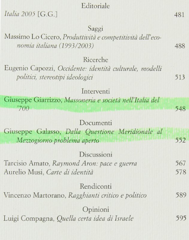 L'ACROPOLI. Rivista bimestrale diretta da Giuseppe Galasso. Anno VI - N. 5, settembre 2005 (economia, massoneria, meridione.)
