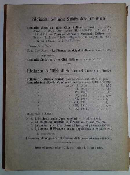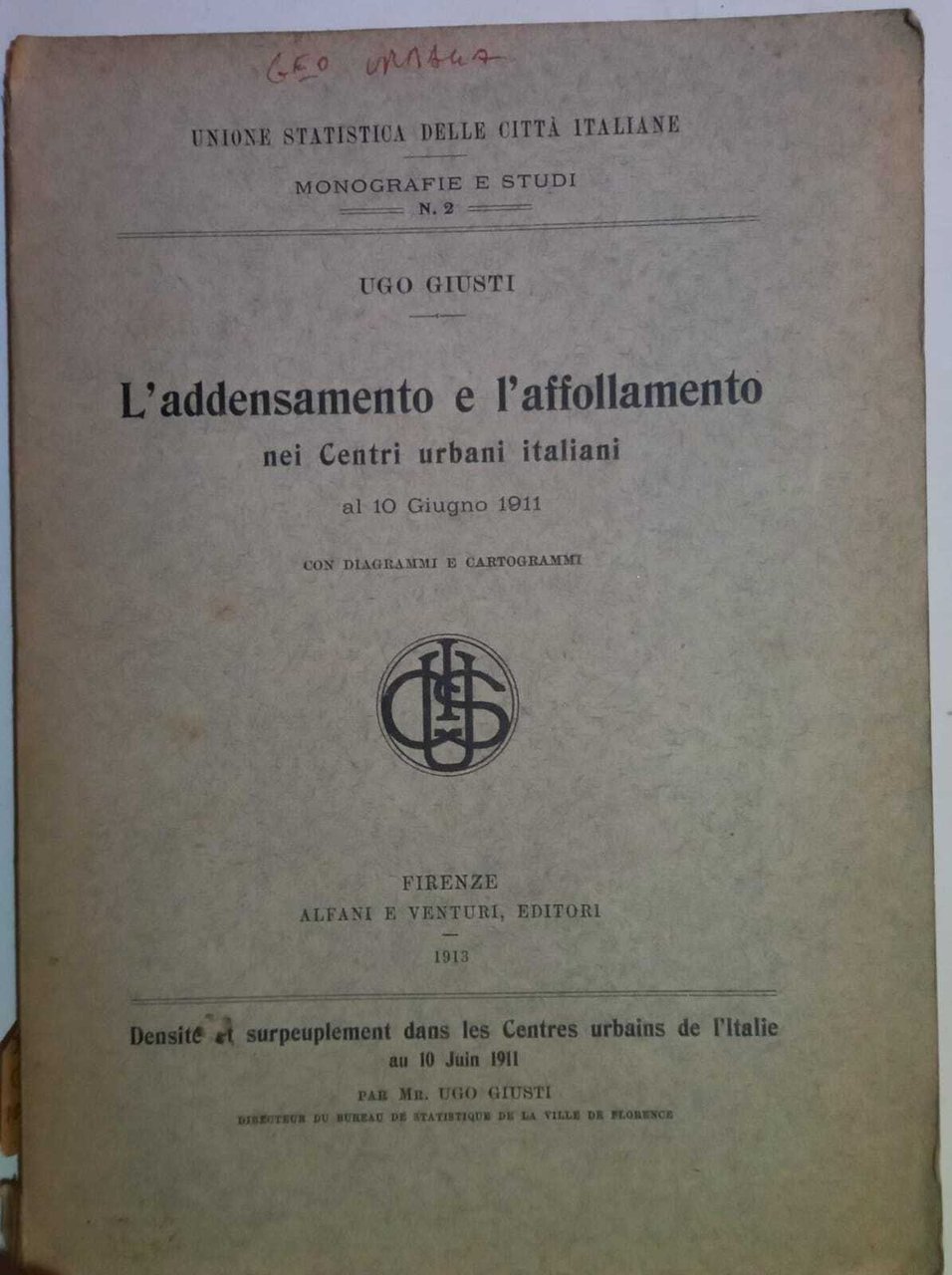 L'addensamento e l'affollamento nei Centri Urbani Italiani al 10 giugno 1911, con diagrammi e cartogrammi. Il volume riporta lievi tagli al dorso , copertina flessibile con bordi stanchi e piccola scritta di biro, interno ingiallito ma in buono stato. 175 Buono (Good) .