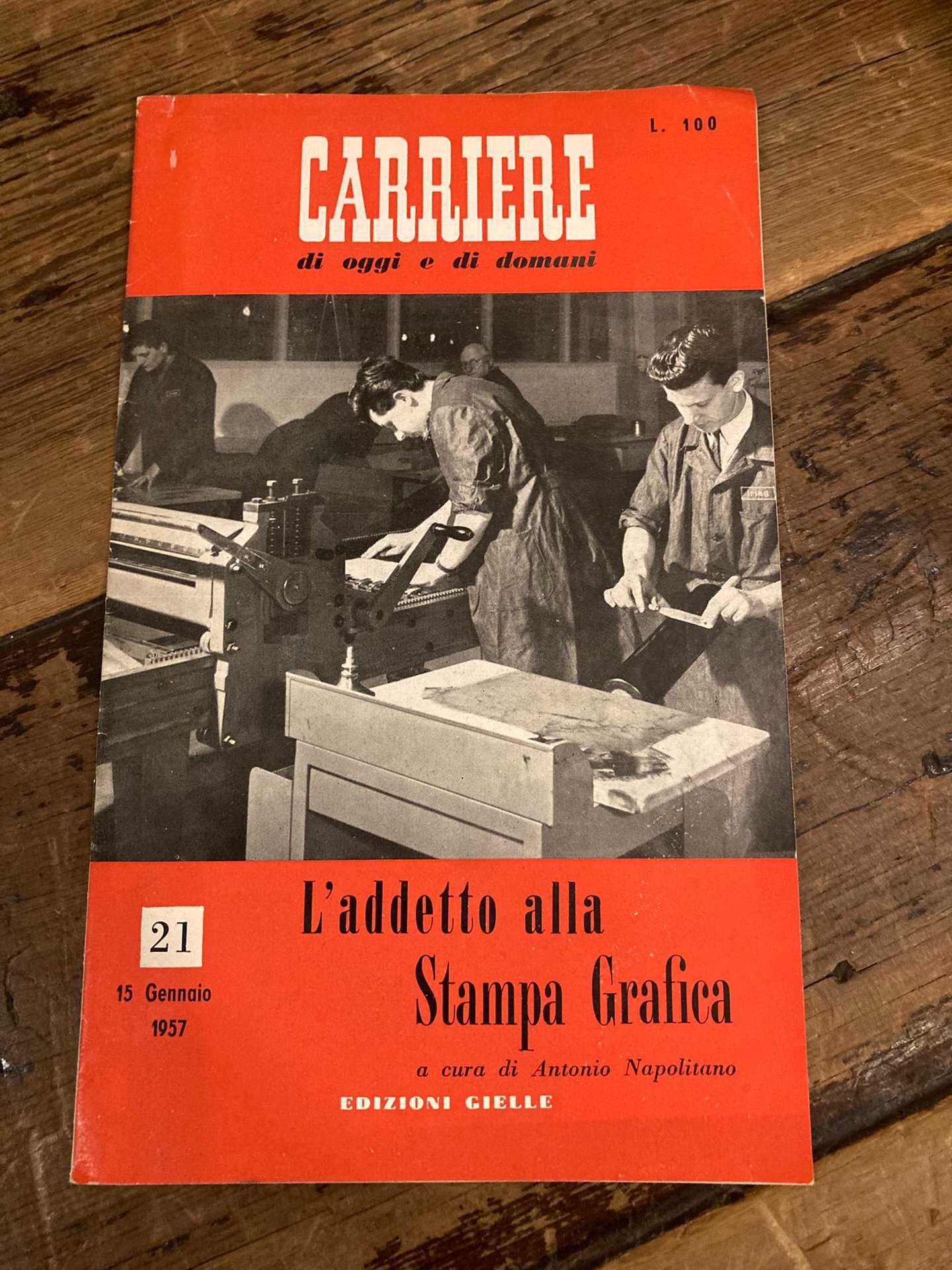 In-8° (21x13 cm), pp. 18, brossura editoriale a tre colori illustrata fotograficamente b/n. Carriere di oggi e di domani, 21. Più che buon esemplare. Non comune opuscolo informativo sulla formazione lavorativa delle figure del tipo/lito/rotocalco-impressore.