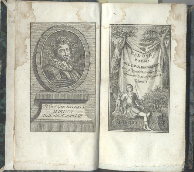 Opera completa in quattro volumi, dedicata alla Regina di Francia e di Navarra Maria de' Medici. Cm.17,6x9. Pg.XLIV, 492; 482; 464; 384. Legature in mz.pelle con titoli in oro al dorso e piatti marmorizzati. Frontespizi decorati con incisione arcadica. Ritratto dell'Autore inciso in ovale all'antiporta del primo volume. Opera adorna di venti tavole decorative incise fuori testo, collazionate all'inizio di ciascuno dei venti canti che compongono l'Opera. Le carte del testo, non le tavole, sono su carta azzurrina. Il primo volume è preceduto dalla "Dedicazione" dell'Autore e da un "Elogio del Cav. Marino scritto dall'Editore". In fine al quarto volume sono riportati gli "Opuscoli del Signor Cav. Marino: La notte; La Pastorella; Lidia abbandonata; Amore incostante; Trastulli estivi; La lontananza; La bella vedova; Duello amoroso". "L'Adone" costituisce lo sfogo sfarzoso e orgiastico di una libera, varia e intemperante immaginazione, di tutto curiosa e a tutto, in fondo, indifferente: anche alla voluttà, nella quale parve ad alcuno di ravvisare il nucleo centrale dell'Opera" (L.Vigliani). > Parenti, "Dizionario dei luoghi di stampa falsi, inventati o supposti", 124, "Edizione curata da Gaetano Poggiali e stampata a Livorno". Graesse, IV, 401, "Cette éd. soignée par Poggiali est la plus complète". Brunet, III, 1434, "L'édition de Londres (Livourne), 1789, fait par les soins de Gaetano Poggiali, est la meilleure de toutes". Gay, I, 42. Gamba, 2002, "Buona è altresì l'edizione moderna di Londra (Livorno), fatta per cura di Gaetano Poggiali". Codice libreria 110387.