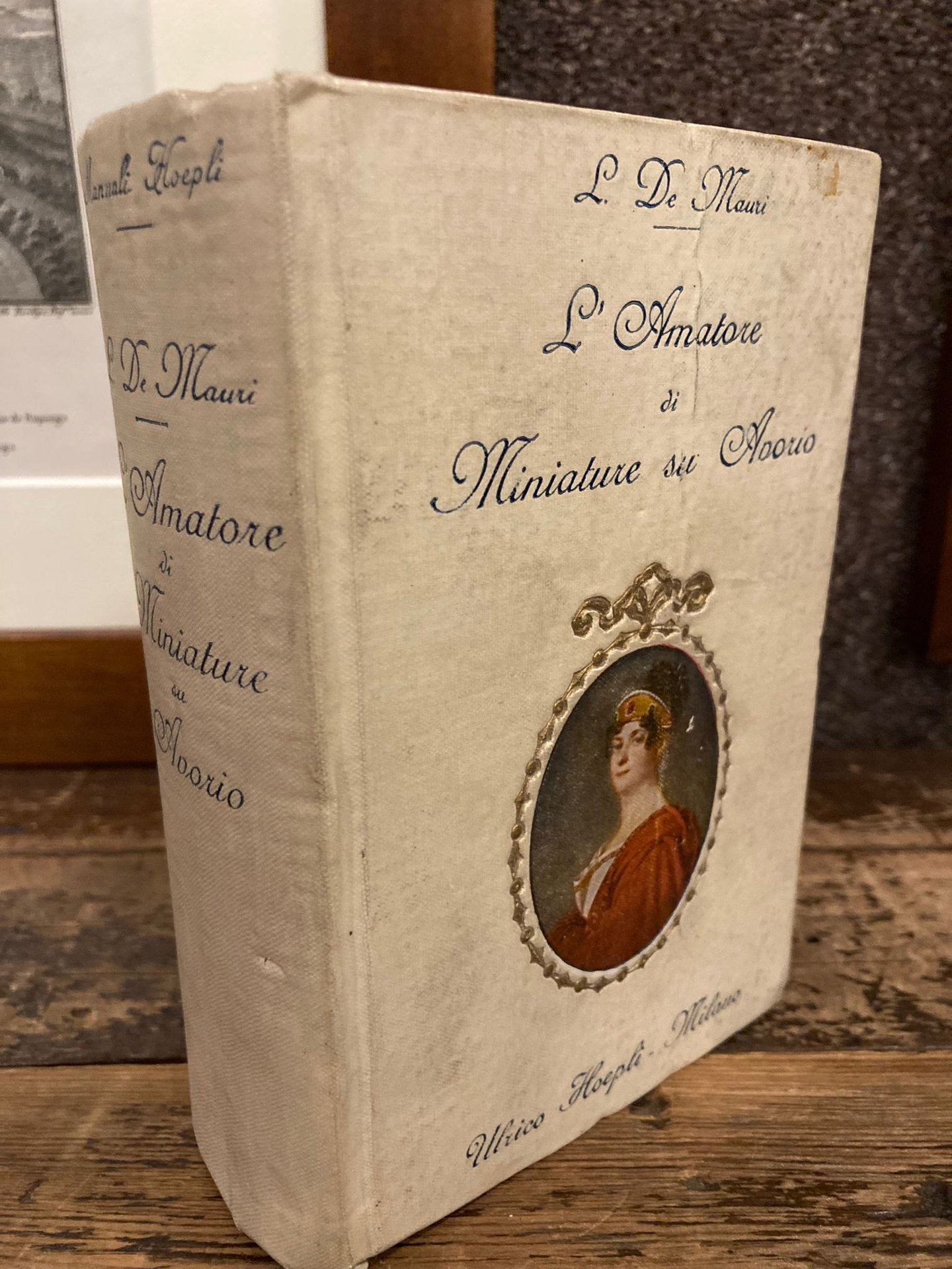 In-16°, pp. XVI, 544, 53 di elenco dei Manuali Hoepli, (11) di elenco alfabetico degli autori; legatura editoriale t. tela color avorio con titolo in blu e riproduzione a colori di una miniatura su avorio al piatto. Figure b/n nel testo, 62 tavv. in b.n. o a colori f.t., alcune delle quali ripiegate, e numerosissime illustrazioni n.t. Minimi segni del tempo e d'uso ma più che buon esemplare. Edizione originale ed unica. L'opera comprende anche estesi cenni biografici sui principali autori di miniature su avorio e un indice analitico finale. Il De Mauri (pseudonimo di Ernesto Sarasino) fu autore di vari volumi sulle porcellane e le arti applicate, di antologie di motti e proverbi, ecc. Cfr. Assirelli, p. 66; Di Masi, p. 175.