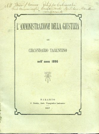 L'amministrazione della giustizia nel circondario tarentino nell'anno 1896. Relazione Statistica esposta alla Assemblea Generale del Tribunale nel giorno 12 Gennaio 1897 per il procuratore del Re Avv. Giosuè De Pirro