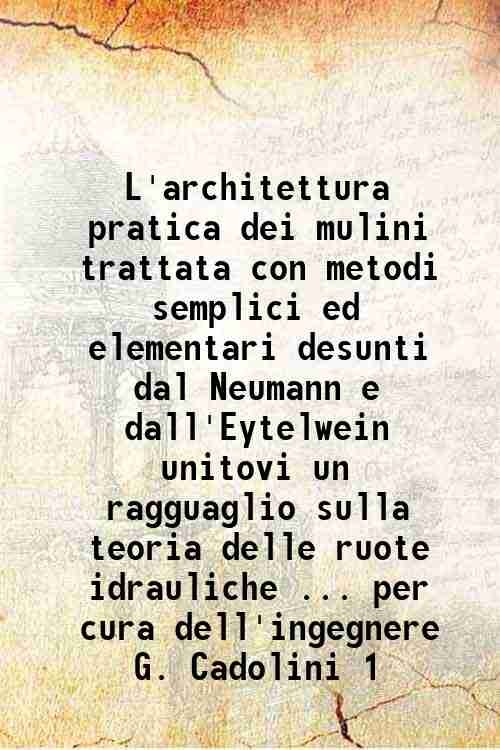 L'architettura pratica dei mulini trattata con metodi semplici ed elementari desunti dal Neumann e dall'Eytelwein unitovi un ragguaglio sulla teoria delle ruote idrauliche . per cura dell'ingegnere G. Cadolini 1 1835