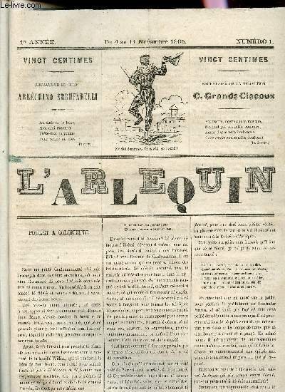 L'ARLEQUIN - 1ere ANNEE - NUMERO 1 - DU 4 AU 11 NOVEMBRE 1865 / POULET A COLOMBINE - COUPS DE BATTE - ARLEQUINADES - SOUS LE MANTEAU D'ARLEQUIN - ARLEQUIN DES MEILLEURES CUISINE ETC. | Libri antichi e moderni | Collectif