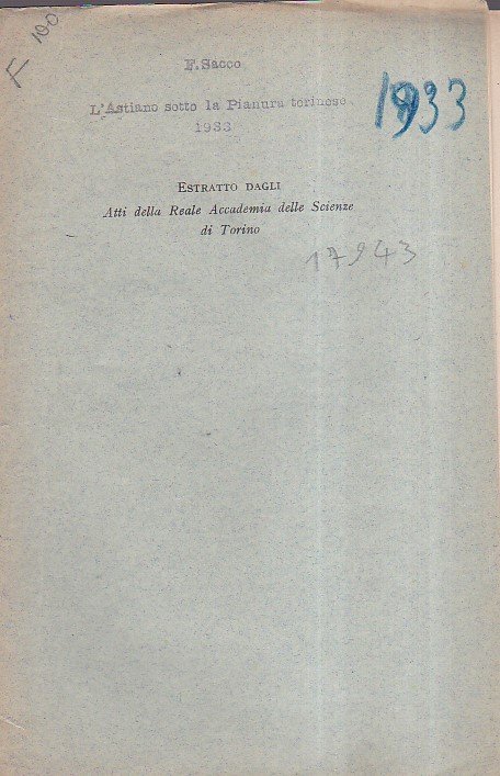 L'Astiano' sotto la Pianura torinese. Nota presentata nell'adunanza del 9 Novembre 1933. Estratto dagli Atti della Reale Accademia delle Scienze di Torino, vol. 69 | Libri antichi e moderni | Sacco Federico
