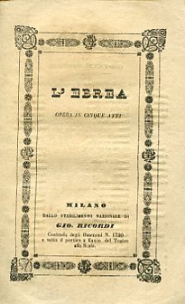 In-16°, pp. 55, brossura editoriale con titolo entro bordura ornamentale. Ottimo stato. Traduzione italiana del libretto composto da Eugène Scribe per 'La Juive' di Halévy, opera lirica rappresentata per la prima volta all'Opéra di Parigi nel 1835. Fortemente suggestionata da Cherubini, ma già presaga del Gran Opéra francese dei decenni a venire, 'La Juive' è ambientata nella Costanza del XV secolo e fu composta tenendo presente alcuni interpreti d'eccezione della prima rappresentazione; per il personaggio di Eleazaro Halévy pensò alle capacità vocali del tenore Adophe Nourrit, mentre, per quello di Rachele, ebbe in mente l'eccezionale talento canoro del soprano Marie Cornélie Falcon.