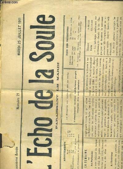 L'ECHO DE LA SOULE - N°21 - MARDI 25 JUILLET 1911 - 2ème ANNEE - la semaine au parlement, à l'interieur, echos militaires, faits divers, chinoiseries (suite), nos vieilles hotelleries de france, l'hotel de la belle hotesse à orthez (basses-pyrenees). | Libri antichi e moderni | Collectif