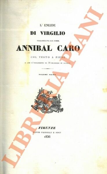 Fiorenze, Passigli, 1836, due volumi in 8° (cm 14,5 x 23,5) legatura in mezza pelle coeva, titoli in oro ai dorsi, pp. (8)-442 con 24 tavole fuori testo incise su acciaio + pp. 506 con 30 tavole fuori testo compresi i ritratti di Virgilio e di Annibal Caro all'antiporta. Edizione illustrata della traduzione di Annibal Caro dell'Eneide virgiliana.