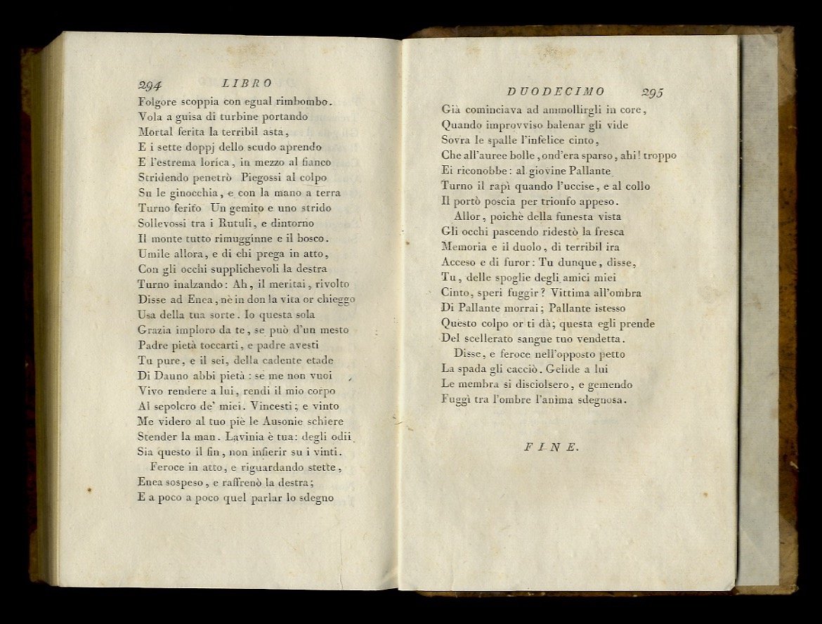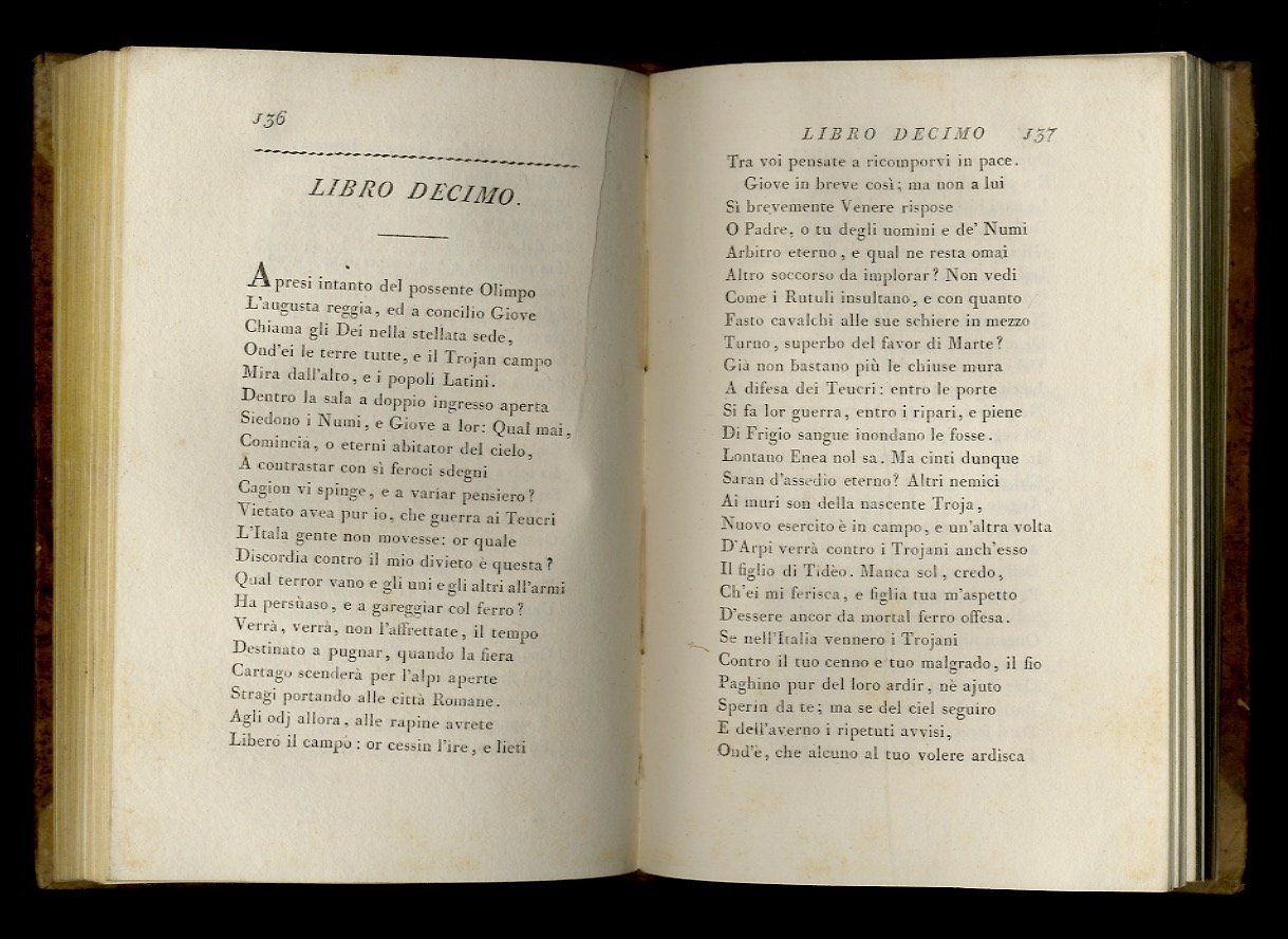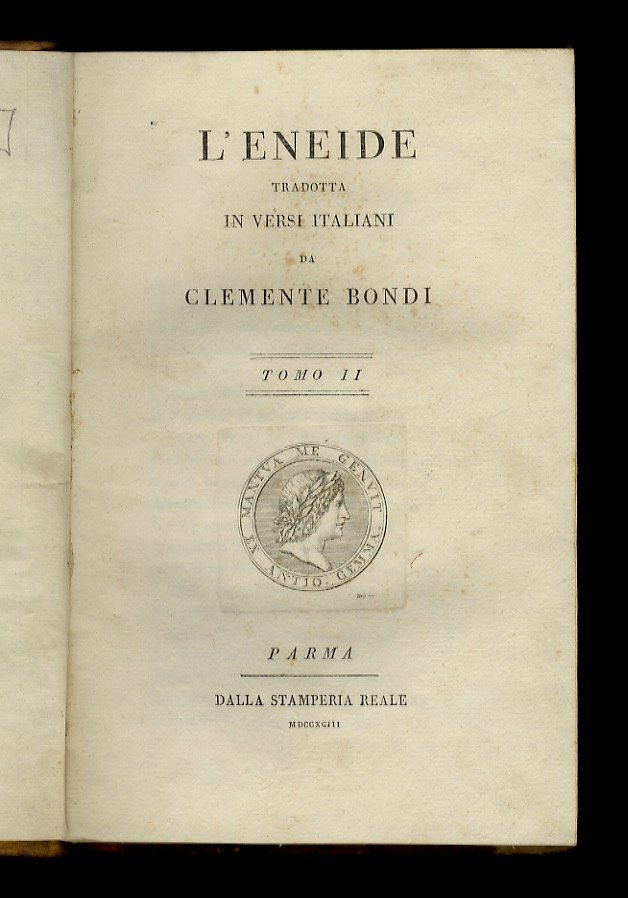 Parma, dalla Stamperia Reale (Bodoni), 1793, in-8, legatura coeva in mezza pelle marmorizzata, titolo su tassello e fregi oro al dorso, piatti in carta radicata, pp. 295, (3). Al frontespizio medaglione inciso in rame con ritrattino in profilo di Virgilio col capo cinto da serto d'alloro (Ex antiq. gemma: "Mantua me genuit"). Prima edizione della traduzione di Bondi (1742-1821): il gesuita oltre che poeta fu infatti buon traduttore di classici, e in questa veste collaborò con G.B.Bodoni. Elegante edizione in ottime condizioni. Manca il Tomo I.