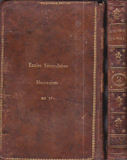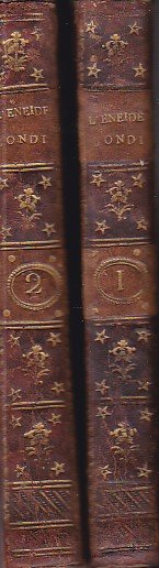 2 voll. in-8° antico (178x113mm), pp. (2), 246, (2); (2), 239, (1); legatura coeva di premio in piena pelle marrone con super libros in oro ai piatti attestante il conferimento in dono del volume al cittadino Carlo Rimini ('Ecoles Secondaires Humanités an XI - Prix d' emulation accordé au Cit. Charles Rimini'), il tutto entro bordura perimetrale dorata. Dorsi lisci con titolo in oro su tassello, tomaison entro tassello circolare, filetti, fiorellini e stelle, il tutto impresso in oro. Tagli colorati a spruzzo, sguardie marmorizzate. Frontespizi incisi su rame con ritratto di Virgilio in medaglione e titolo entro bordura. Piccoli restauri ai dorsi. Buon esemplare. Impressione torinese della traduzione dell'Eneide' del Bondi (Mezzani, Parma, 1742-Vienna, 1821), poeta e uomo di lettere, fu bibliotecario dell'Arciduchessa d'Austria, Beatrice, cui la versione è dedicata. ' Il risultato della presunta consonanza del Bondi con Virgilio fu una lettura corretta ma incolore del poeta latino, ridotto nelle dimensioni, di un monotono elegiaco e didascalico del Settecento (per esempio gli sfuggì completamente il valore ideologico delle Georgiche, interpretate come una semplice 'lezione di precetti' e una gran prova di stile, una veste ricamata a piccoli fiori in confronto al grande arazzo dell'Eneide), e un'altrettanto incolore lettura di Ovidio, emendato dei luoghi che potevano offendere la morale corrente: anche in queste traduzioni, che ad alcuni sembrarono superare il precedente illustre del Caro, i risultati migliori sono ottenuti sul piano del calligrafismo descrittive, sì che esse ci si presentano come una naturale prosecuzione dell'opera precedente.' (Gennaro Barbarisi in Dizionario Biografico degli Italiani, volume 11, 1969). Cfr. Gamba, 2497-2499.