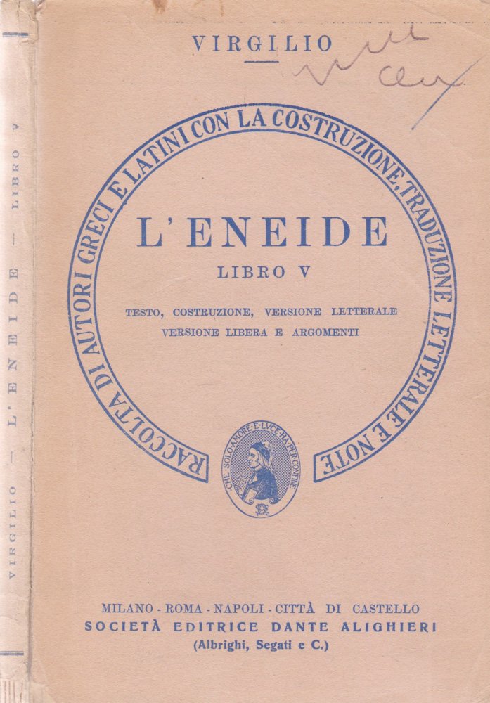 Opera incompleta, disponibile libro V. Testo, costruzione, versione integrale, versione libera e argomenti. Brossura editoriale in cartonato fessibile, copertina con titoli su piatto e dorso, scolorita dal tempo, con bordi stanchi, aloni di pulviscolo, strappi alla ceriera, macchioline di conservazione, tracce di penna al piatto e piccole mancanze al dorso. Tagli ambrati con velature di polvere. Legatura allentata. Pagine integre, con naturale ingiallimento da fattore tempo, talvolta più brune ai margini, completamente fruibili con molteplici sottolineature, piccoli segni ed appunti d'appartenenza a penna e matita. Numero di pagine 121.