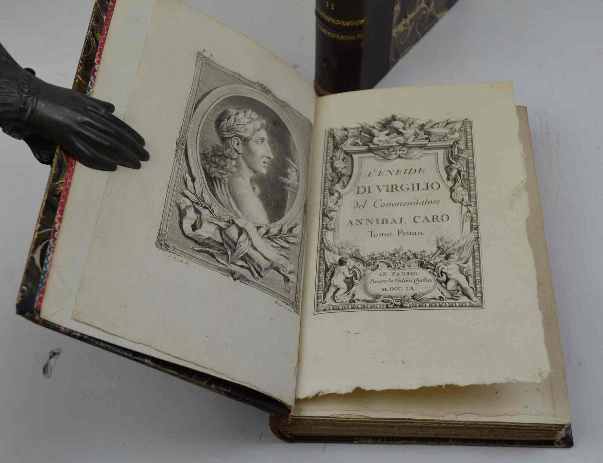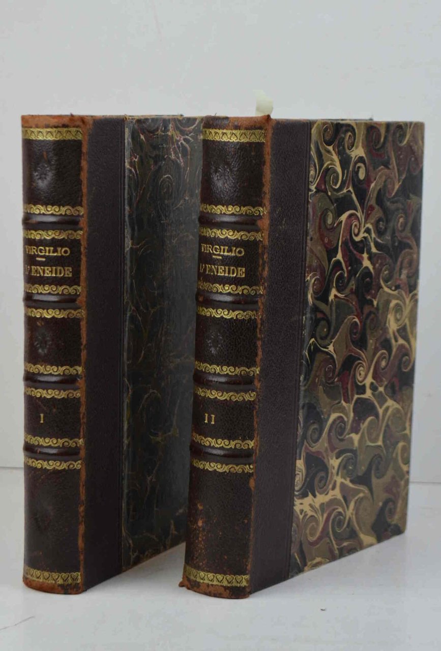 Due volumi di cm. 23, pp. (8) 314 (2); (4) 342 (2). Frontespizio inciso ed un ritratto (Virgilio e Marchetti) a ciascun volume, 12 tavole poste all'inizio di ciascun libro, 12 testate e 6 grandi finalini. Legatura ottocentesca in mezza pelle, dorsi a nervi con titoli e fregi in oro ed a secco. Sguardie marmorizzate. Qualche leggera brunitura, un po' più evidente al margine bianco di una carta del secondo volume, peraltro esemplare particolarmente marginoso e complessivamente ben conservato. Bella e pregiata edizione dell'Eneide tradotta dal Marchetti. Ricercata per le tavole eseguite dai più valenti incisori del tempo. Cfr. Cohen-Ricci 1021.