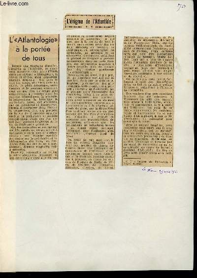 1941. In-4. En feuillets. Bon état, Couv. convenable, Dos satisfaisant, Intérieur frais. 1 feuillet. Coupures de journaux. . . . Classification Dewey : 1.9-Phénomènes mystérieux et controversés