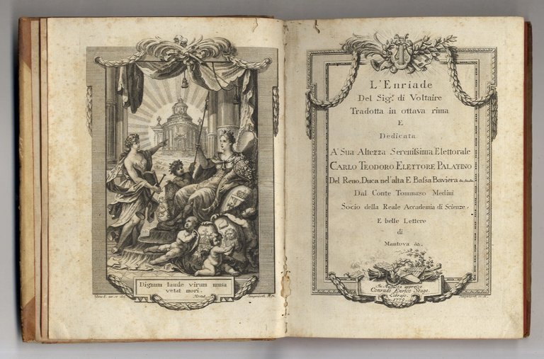 L'Enriade del sig.r di Voltaire tradotta in ottava rima e dedicata a sua altezza serenissima elettorale Carlo Teodoro elettore palatino [.] Dal conte Tommaso Medini [.].