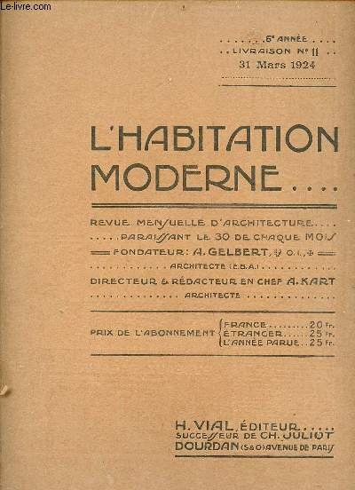 L'habitation moderne revue mensuelle d'architecture - 6e année livraison n°11 31 mars 1924 - Propriété de Mme Vve D. à Soissons MM.Guesand et Robin architectes - propriété de M.S. à Suresnes architecte : M.Tresal - décoration de hall C.Richard . | Libri antichi e moderni | Collectif