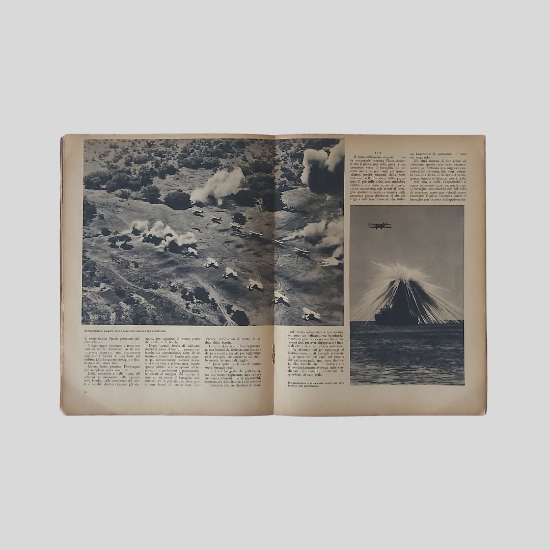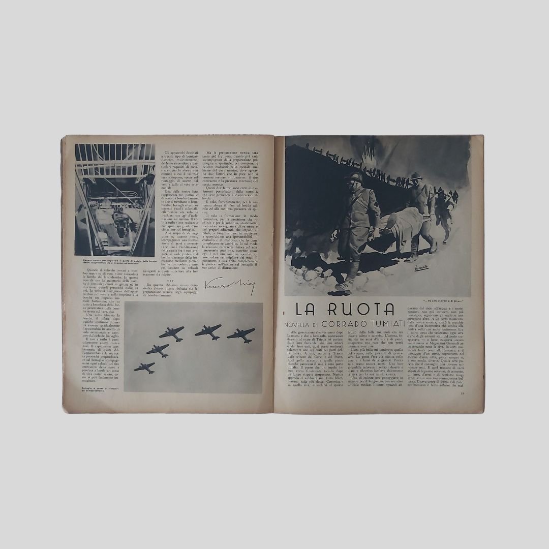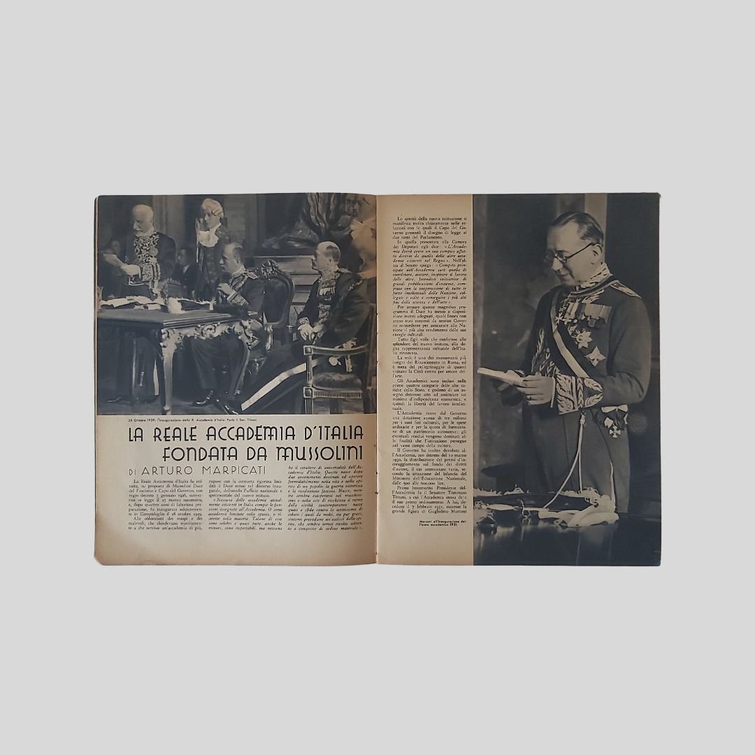 In-8°, pp. 32. Con numer. ill. interc., riproduz. fotogr. e facs. Pubblicità di prodotti farmaceutici a piena pagina. Eccetto piegolina all’angolo inferiore della copertina, insignificanti tracce d’uso. Non comune. «L’Illustrazione del Medico», aprile 1938. Uno spaccato dell’Italia nell’anno delle leggi razziali. «L’Illustrazione del Medico», rivista mensile edita dai Laboratori farmaceutici D. Maestretti di Milano, uscì per la prima volta nell’ottobre del 1933. Nonostante la vocazione di periodico farmaceutico aveva un respiro culturale ampio, con articoli di letteratura, arte, medicina e attualità. Collaborò alla rivista anche il fotografo Bruno Stefani, le cui immagini di monumenti e paesaggi italiani comparivano spesso sulle copertine. In questo numero:<BR>FRANCO Enrico Emilio – Gli ermafroditi nel mito e nella realtà, pp.1-5<BR>MARPICATI Arturo – La reale Accademia d’Italia fondata da Mussolini. Ritratto fotogr. di Gabriele d’Annunzio, Marconi e Mussolini, pp.6-10. <BR>LIOY Vincenzo – Il bombardamento aereo e la sua tecnica, pp. 11-18<BR>TUMIATI Corrado – La ruota. Novella. , Illustrazioni di Boccasile. pp. 19-21. <BR>CASSINELLI Bruno – Il colpevole di fronte all’avvocato. Riproduz. fotogr. tratte da “L’uomo delinquente” di Cesare Lombroso: Brigante della Calabria, Ladro napoletano, Brigante, pp. 22-25. <BR>ALBERTI Giuseppe – Domenica d’aprile nella Ellade luminosa, pp. 26-32
