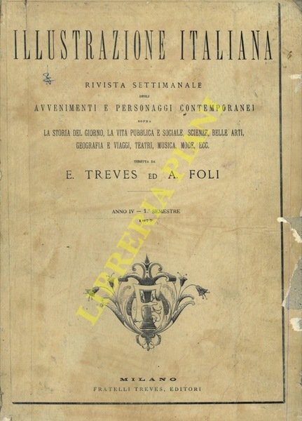 Milano, Treves, 1877, A. IV, primo semestre composto da 25 fascicoli (1-25, 24 giugno) rilegati in un volume in-4to (cm. 37 x 27) legatura originale cartonato (qualche abrasione, dorso conservato ma staccato), pp. 400 completamente illustrato da incisioni xilografiche anche a piena pagina e doppie.