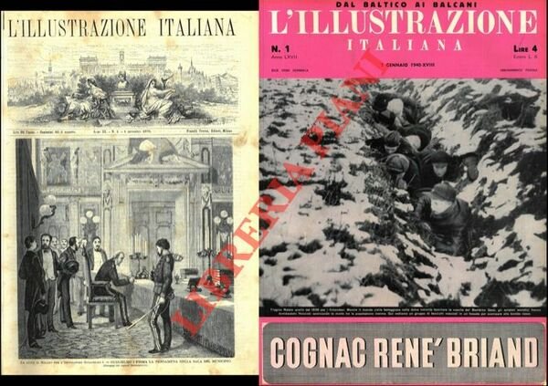 Milano, Treves (e Garzanti, dal 1940) 1875/1962, abbiamo disponibili le annate dal 1875 al 1943. Raccolta pressochè completa di 66 annate della rivista rilegate in 137 volumi in-4° (cm. 40 x 30 circa) i primi 66 volumi (dal 1875 al 1915) rilegati mezza pelle d'epoca con titoli e fregi dorati al dorso, i restanti volumi (dal 1916 al 1943) rilegati tutta tela marrone coeva con titoli ai dorsi e impressioni a secco ai piatti, tutta tela verde con tassello e fregi dorati ai dorsi (l'annata 1937 è in fascicoli sciolti). Ciascuna annata è composta da 52 o 53 fascicoli completamente illustrati da incisioni, litografie, fotografie e tavole in nero, talora anche doppie o ripiegate, in nero e a colori. Serie cronologica con le seguenti mancanze: 1889 manca il primo semestre, 1914 manca il primo semestre, 1943 mancano i fascicoli dal 30 al 52. Il 1º novembre 1875, esce il primo numero de L'illustrazione italiana (si tratta effettivamente del primo numero anche se al frontespizio viene citato l'Anno III in quanto nel corso del 1874 i fratelli Treves, già editori della rivista “Nuova illustrazione universale” rilevano una rivista concorrente che stava dando buona prova di sé a Roma: «L'Illustrazione. Rivista italiana», diretta dall'artista romano Alessandro Foli. Dall'unione delle due riviste nacque L'illustrazione italiana, che uscì con la nuova testata a partire dal 1º novembre 1875) e comincia ad avere un'ampia diffusione negli ambienti della medio-alta borghesia, grazie alla qualità degli articoli e soprattutto delle illustrazioni, spesso affidate ad artisti di primo piano come Achille Beltrame, Pietro Scoppetta, Luigi Bompard, Giuseppe Cosenza ed Ettore Ximenes (il quale svolgeva anche le funzioni di vicedirettore). Oltre che all'opera di artisti di grido, il pregio delle fonti iconografiche era dovuto anche alla scelta di utilizzare per la stampa incisioni in legno invece che litografie, che consentivano di ottenere un'altissima resa a partire dai bozzetti di base. Tale qualità fu mantenuta poi nel tempo anche in seguito all'avvento della fotografia, tecnica che vide rappresentati sulle pagine dell'”Illustrazione” alcuni tra i migliori fotogiornalisti nazionali: Armando Bruni, Mario Crimella, Giulio Parisio ed Emilio Sommariva[5]. La prima fotografia venne pubblicata sul numero del 18 luglio 1885 (una spada del XVI secolo conservata nel Museo Poldi Pezzoli di Milano). Con l'avvento della fotografia la rivista adottò la carta patinata, che garantiva una migliore qualità delle immagini. Per quanto riguarda la scrittura dei testi, il periodico si avvalse della collaborazione, in qualità di articolisti, di alcuni dei nomi più importanti della letteratura italiana, Giosuè Carducci, Grazia Deledda e Luigi Pirandello (premi Nobel per la letteratura), Giovanni Verga, Gabriele D'Annunzio, Luigi Capuana, Edmondo De Amicis. La grande fortuna dell'Illustrazione Italiana durò fino alla morte di Emilio Treves (1916), dopo la quale, pur avendo ancora tra i propri collaboratori scrittori del calibro di Eugenio Montale, Elio Vittorini, Salvatore Quasimodo, Riccardo Bacchelli e altri, la rivista cominciò a mostrare i segni di un lento declino. La promulgazione delle leggi razziali fasciste accelerò il processo in atto: nel 1939 la Treves dovette cedere l'azienda alla Garzanti. Verso la metà del 1942, in seguito agli eventi della seconda guerra mondiale, L'Illustrazione rallentò le sue uscite, fino ad essere trasformata in mensile nel 1951 da Livio Garzanti. Gli anni cinquanta con la crescita vertiginosa dei rotocalchi, settimanali popolari di attualità. L'Illustrazione Italiana vide ridursi progressivamente il suo spazio, finché Garzanti la chiuse nel dicembre 1962. Cfr. web.
