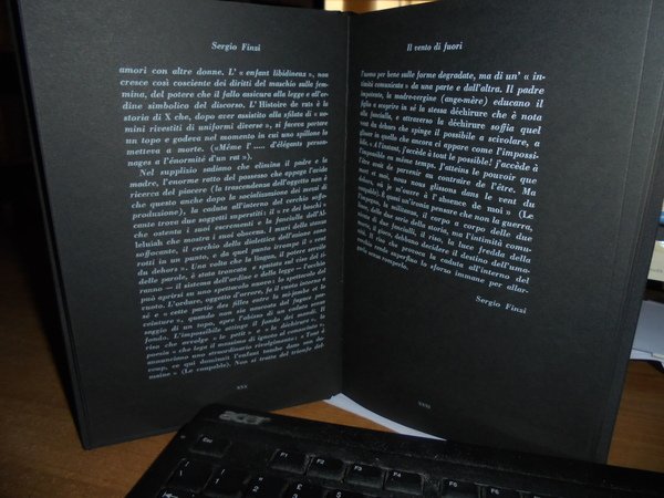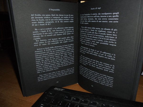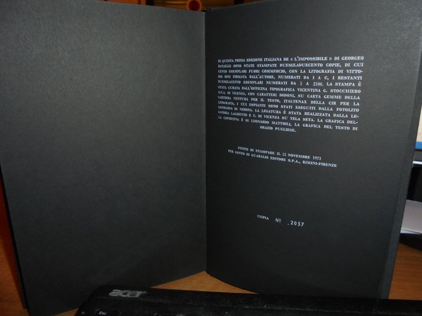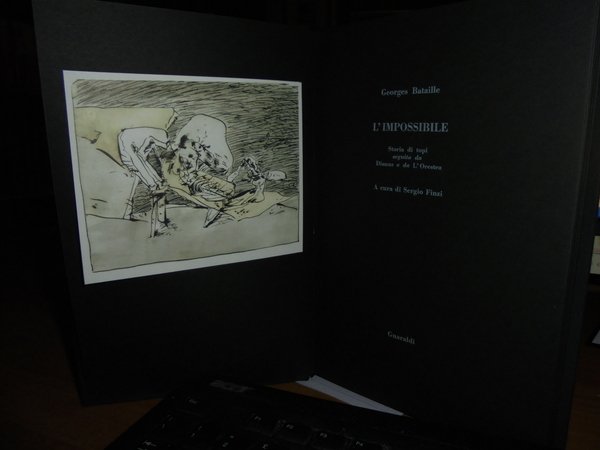 Georges, Bataille. Rimini, Guaraldi Editore, 1973. L’IMPOSSIBILE. STORIA DI TOPI. SEGUITO DA:DIANUS E DA L’ORESTEA. Prima edizione italiana. In-8° piccolo, tela nera con titolo in bianco al dorso, disegno impresso in bianco al piano anteriore. XXXII, 195, (7) pp. Con la riproduzione di una litografia di Vittorio Bini, applicata all’ antiporta disegno di Leonardo Mattioli. Edizione pregiata stampata con caratteri bodoni bianchi su carta a mano pesante di colore nero. Tiratura di 2200 esemplari numerati (Ns. copia N. 2037). Come nuovo. Neg. mob. F