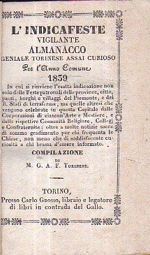 L' Indicafeste Vigilante. Almanacco Geniale Torinese assai curioso per l' anno comune 1839 in cui si rinviene l' esatta indicazione non solo delle Feste patronali delle province, città, paesi, borghi e villaggi del Piemonte, e dei R. Stati di terraferma, ma quelle altresì che vengono celebrate in questa Capitale dalle Corporazioni di ciascun' Arte e Mestiere, e dalle rispettive Comunità Religiose, Collegi e Confraternite: oltre a molte notizie sacre di sommo gradimento per chi frequenta.